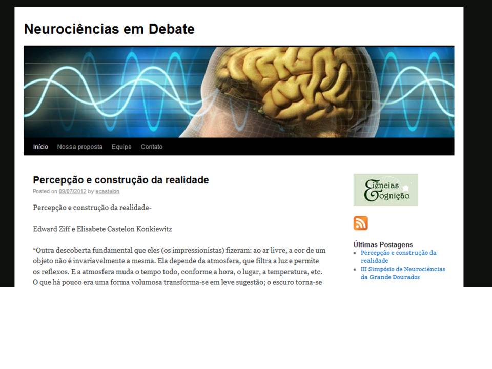 “Neurociências em Debate” é um blog de Ciências e Cognição, produzido com o fim de publicar textos e reflexões envolvendo o tema “neurociências”. Sua equipe é formada pelos pesquisadores Elisabete Castelon Konkiewitz, Edward Ziff, Glaucio Aranha e Alfred Sholl Franco. Para acessar o blog, visite:http://cienciasecognicao.org/neuroemdebate/