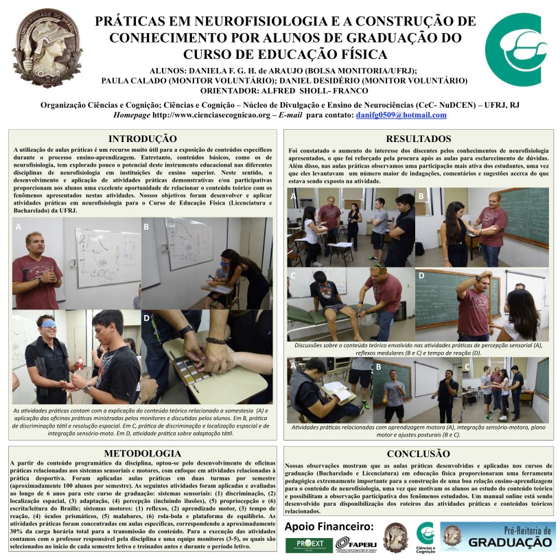 “Práticas em Neurofisiologia e a Construção de Conhecimento por Alunos de Graduação do Curso de Educação Física” foi um dos temas dos cartazes apresentados por membros do Ciências e Cognição durante a “XXXV Jornada Giulio Massarani de Iniciação Científica, Tecnológica, Artística e Cultural” (JICTAC-2013), evento que teve como objetivo principal expor os resultados de programas e projetos de extensão da universidade em andamento ou concluídos.