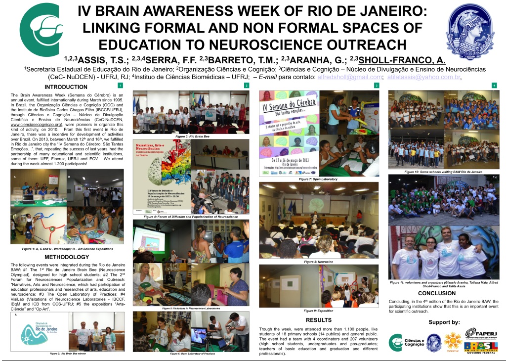 Uma das atividades em questão é a “IV Semana do Cérebro”, um evento anual realizado internacionalmente durante o mês de março, desde 1995. No Brasil, a Organização Ciências e Cognição (OCC) e o Instituto de Biofísica Carlos Chagas Filho (IBCCF), através de “Ciências e Cognição – Núcleo de Divulgação Científica e Ensino de Neurociências” (CeC-NuDCEN) foram os pioneiros em organizar esse tipo de prática, no ano de 2010. Nesta primeira edição, ocorrida no Rio de Janeiro, houve incentivo para o desenvolvimento de atividades deste caráter em todo o País.
