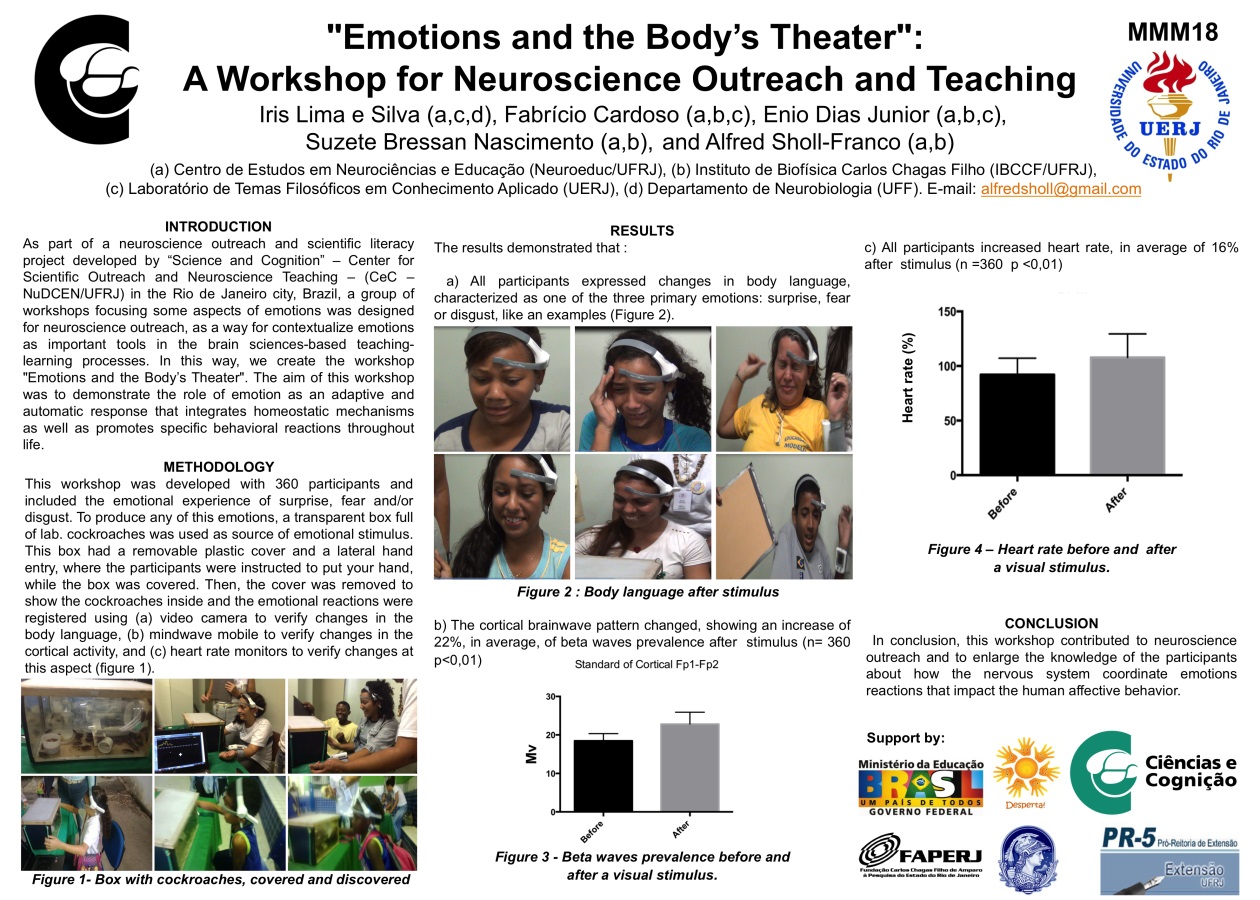 Como parte do projeto desenvolvido por “Ciências e Cognição – Núcleo de Divulgação Científica de Ensino de Neurociências” (CeC-NuDCEN), no Rio de Janeiro – Brasil, um conjunto de oficinas focando em alguns aspectos das emoções foram planejadas como forma de contextualizá-las como importantes ferramentas no processo de ensino-aprendizagem nas ciências básicas do cérebro. Neste sentido, criamos a oficina “Emoções e teatro do corpo”. O objetivo dela foi demonstrar o papel das emoções como uma resposta automática e adaptável que integra mecanismos homeostáticos, bem como promove reações comportamentais específicas ao longo da vida.