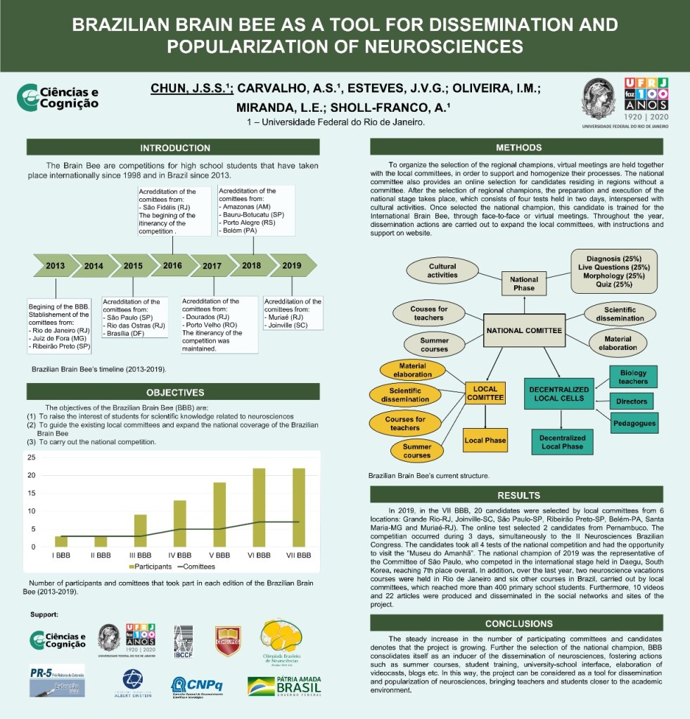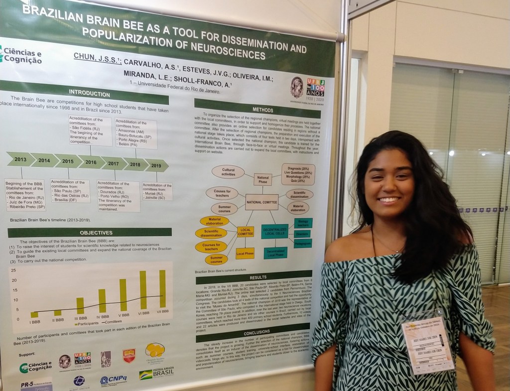 No dia 03/05/2019, foi apresentado, pela aluna bolsista Judy Chum, durante o Congresso da Sociedade Brasileira de Neurociência e Comportamento (SBNeC), em Campos do Jordão (SP), o trabalho “Brazillian Brain Bee as a toll for dissemination and popularization of neuroscience”. O trabalho é o resultado de pesquisa relacionada ao projeto de desenvolvimento do Olimpíada Brasileira de Neurociências – OBN, tomando-a como uma ferramenta para popularização das neurociências e fonte de motivação para estudantes, no aprofundamento e engajamento com a área.