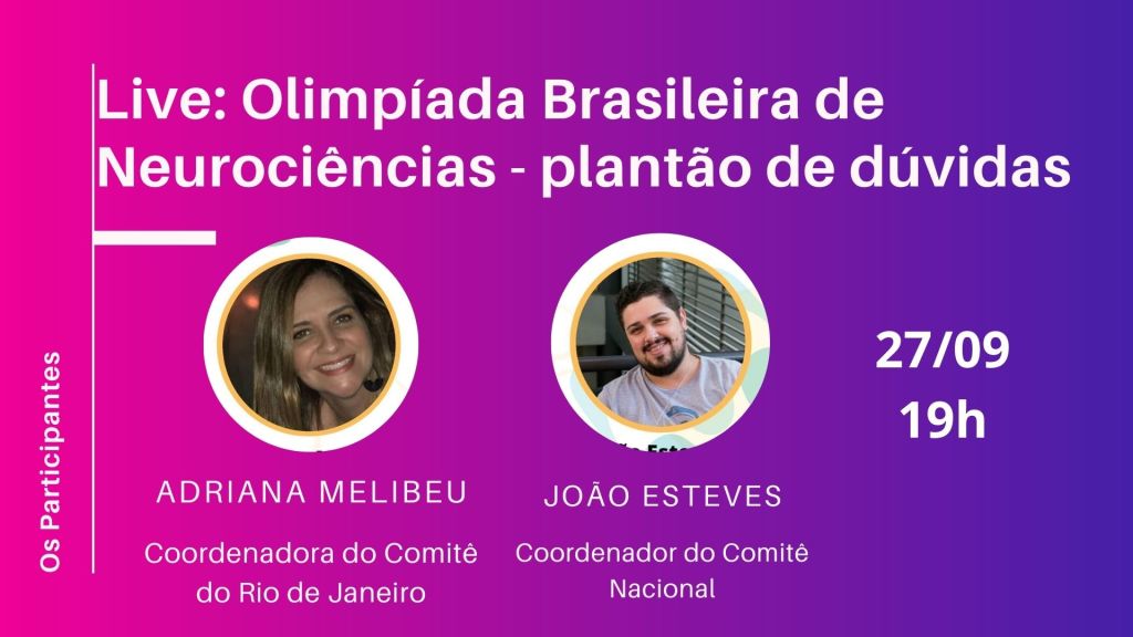 No dia 27 de setembro de 2020 (domingo), às 19h, acontecerá a live de plantão de dúvidas sobre a Olimpíada Brasileira de Neurociências (OBN). Participarão da live João Esteves, representando a Coordenação Nacional da OBN, e Adriana Melibeu, representando o Comitê do Rio de Janeiro.
