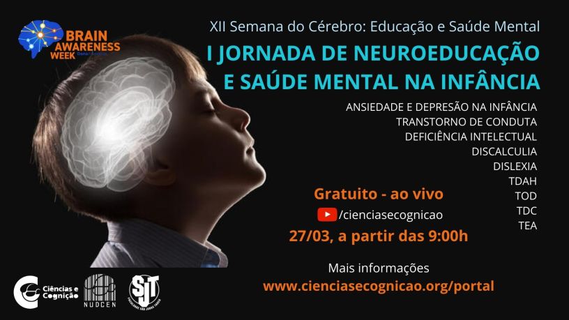 A I Jornada de Neuroeducação e Saúde Mental na Infância ocorreu no dia 27/03, de 09:00 às 16:30. Foram apresentadas oito ‘lives’, disponíveis no canal do YouTube Ciências e Cognição (youtube.com/cienciasecognicao), abordando diversos transtornos do desenvolvimento, suas características e especificidades: histórico e introdução; fisiopatologia básica (aspectos neurobiológicos); apresentação do transtorno em sala de aula (principais características); sintomas, critérios de diagnósticos e apresentação clínica; tratamento e prognóstico; e estratégias de manejo do transtorno em sala de aula.
