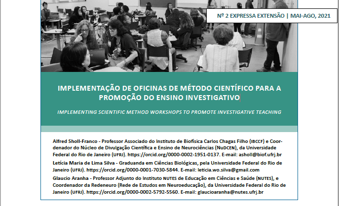 Foi publicado no periódico científico Expressa Extensão, o artigo IMPLEMENTAÇÃO DE OFICINAS DE MÉTODO CIENTÍFICO PARA A PROMOÇÃO DO ENSINO INVESTIGATIVO, da autoria de Alfred Sholl-Franco, Letícia Silva e Glaucio Aranha. O artigo descreve o processo de criação de um conjunto de oficinas de capacitação para a implementação de projetos de aprendizagem investigativa e sua adaptação para o ambiente online, em face da pandemia de COVID-19. Apresenta os resultados das transformações experimentadas e dos desafios encontrados. O artigo pode ser acessado através do link: https://periodicos.ufpel.edu.br/ojs2/index.php/expressaextensao/article/view/20525/0
