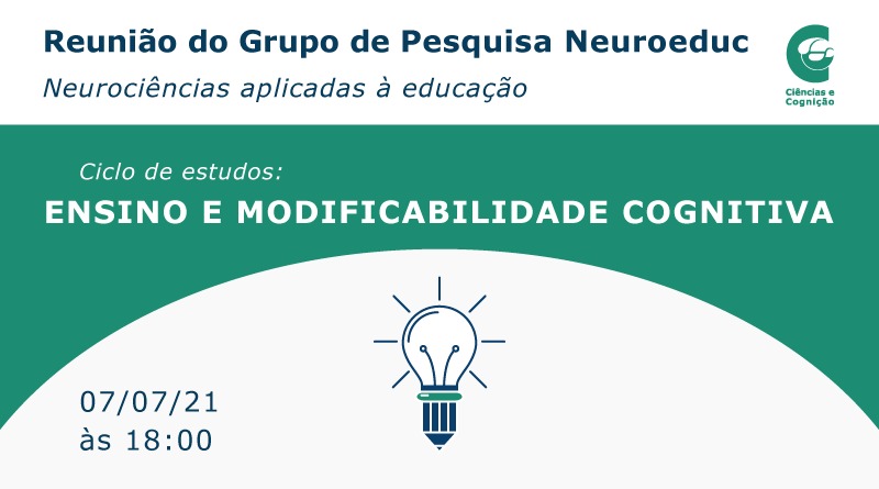 No dia 07/07, de 18:00 às 19:00, será realizada a reunião mensal do grupo de pesquisa Neuroeduc – Neurociências Aplicadas à Educação, de Ciências e Cognição, que congrega pesquisadores de diferentes instituições, dando continuidade ao Ciclo de Estudos ‘Ensino e Modificabilidade Cognitiva’. Na reunião do dia 07/07, será dada continuidade ao estudo da obra “Além da inteligência: aprendizagem mediada e a capacidade de mudança do cérebro“, de Reuven Feuerstein, Refael feuerstein e Louis Falik. Serão discutidos os capítulos: