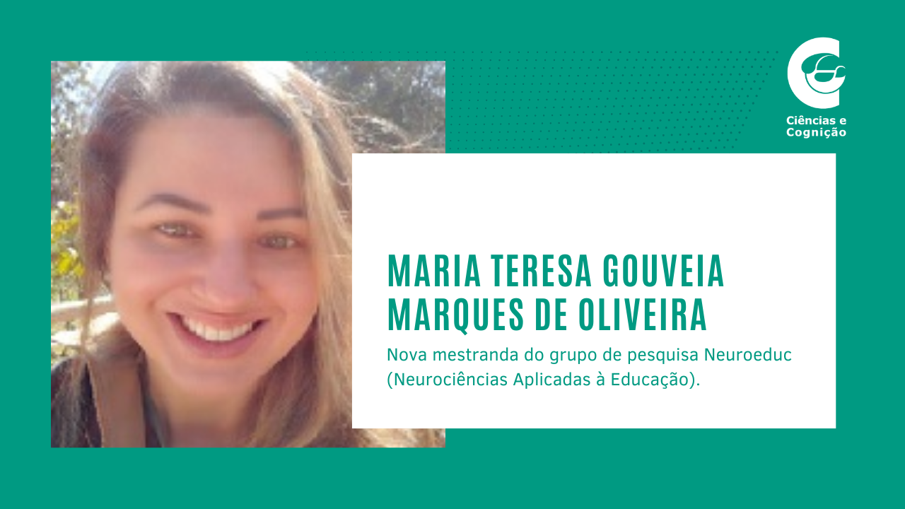 Maria Teresa é graduada em Direito, pelo Centro Universitário da Cidade (2008) e em Pedagogia, pela Universidade Candido Mendes (2011). Atua, como professora, no CIEP Doutor Antoine Margarinos Torres Filho, tendo interesse no estudo de dificuldades de aprendizagem, vínculos afetivos e transtornos de desenvolvimento de coordenação. Começou a participar das reuniões do grupo de pesquisa Neuroeduc (Registro no CNPq http://dgp.cnpq.br/dgp/espelhogrupo/21128), em 2021, e de outras atividades ligadas a Ciências e Cognição, como o curso de Introdução ao Método Científico para a Aprendizagem Investigativa (IMCAI), promovido pelo projeto Redeneuro.