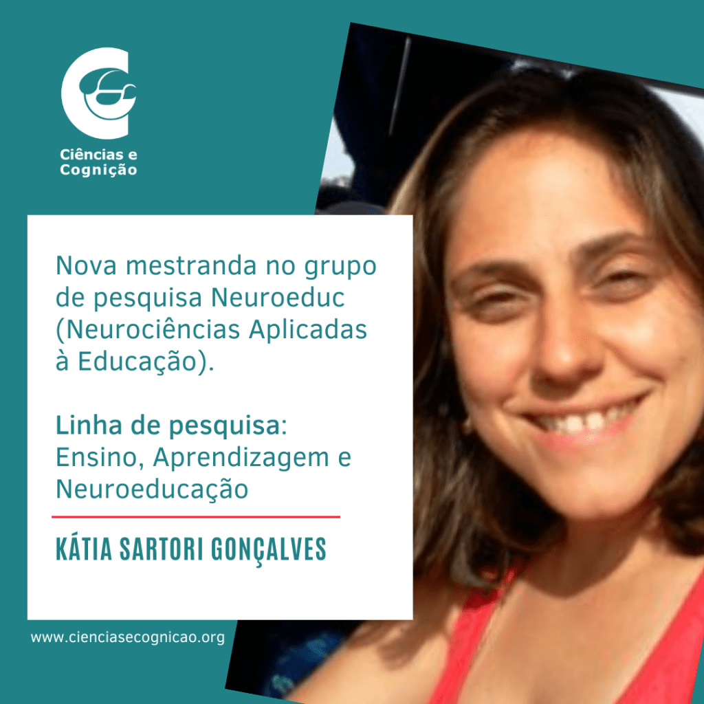 Katia Sartori Gonçalves é a mais nova mestranda a integrar o grupo de pesquisa Neuroeduc – Neurociências Aplicadas à Educação (Registro no CNPq http://dgp.cnpq.br/dgp/espelhogrupo/21128), tendo sido aprovada no processo seletivo do Mestrado Profissional em Formação em Ciências para Professores (ProfiCiências), da Universidade Federal do Rio de Janeiro (UFRJ), tendo como orientador o Prof. Alfred Sholl-Franco. Ela atuará na linha de pesquisa “Ensino, Aprendizagem e Neuroeducação”, com o tema: conscientização sobre distúrbios de aprendizagem em professores do ensino médio.