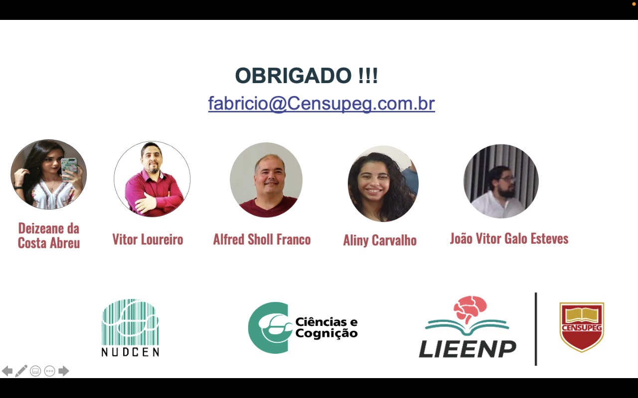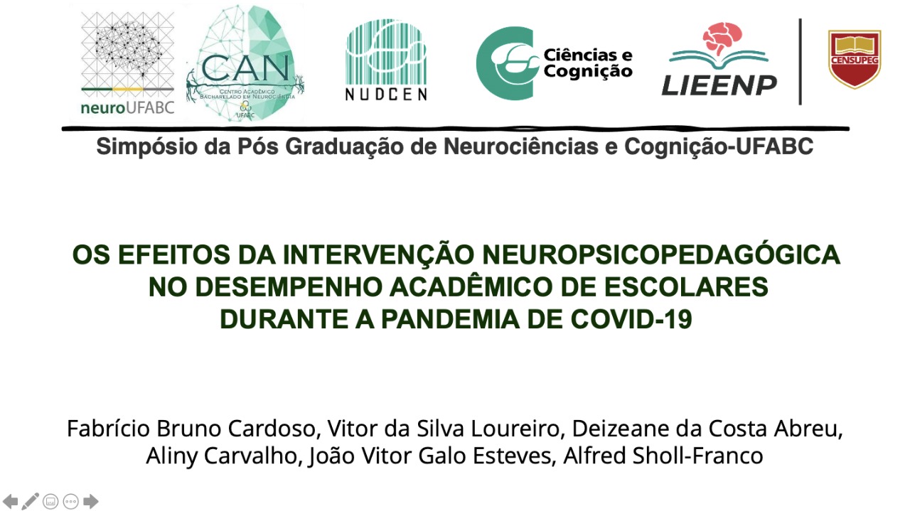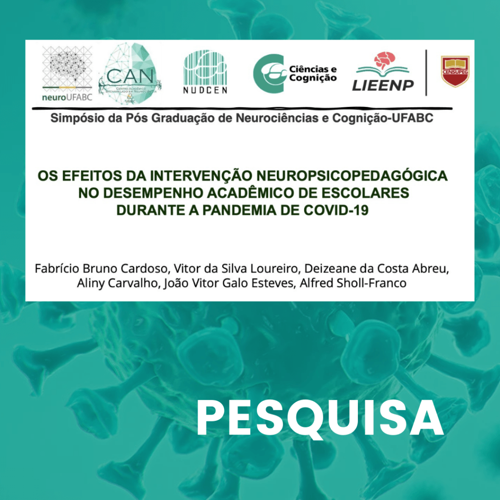 No dia 06/12/2021, foi apresentada a comunicação “Os efeitos da intervenção neuropsicopedagógica no desempenho acadêmico de escolares durante a pandemia de Covid-19“, no Simpósio da Pós-Graduação de Neurociências e Cognição, da Universidade Federal do ABC (UFABC). O trabalho é resultado de pesquisa desenvolvida pelo Laboratório de Inovações Educacionais e Estudos Neuropsicopedagógicos (LIEENP/CENSUPEG), coordenado pelo Prof. Dr. Fabrício Bruno Cardoso, em parceria com a Organização Ciências e Cognição (OCC) e com a Universidade Federal do Rio de Janeiro (UFRJ). Participaram deste trabalho como coautores: Fabrício Bruno Cardoso (LIEENP/Censupeg; OCC), Vitor da Silva Loureiro (PPGP-GE/UNICID; LIEENP/Censupeg), Deizeane da Costa Abreu (LIEENP/Censupeg), Aliny Carvalho (IBCCF/UFRJ; OCC), João Vitor Galo Esteves (IBCCF/UFRJ; OCC) e Alfred Sholl-Franco (IBCCF/UFRJ; OCC).